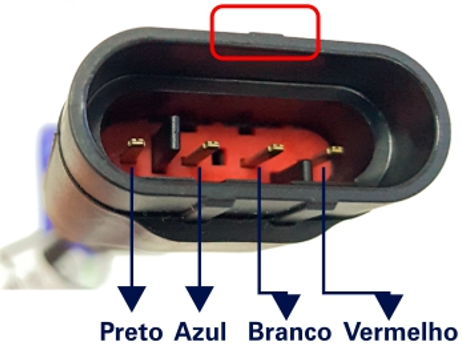 No conector do ramal, o pino negativo está localizado à esquerda, olhando de frente pra ele, com a trava de encaixe voltada para cima.
