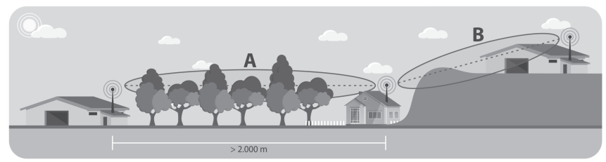 Para garantir um sinal forte e estável, as antenas transmissora e receptora do i-Allerta devem ser instaladas em linha de visão direta, sem qualquer obstrução entre elas, como terrenos irregulares, vegetação ou edificações. Qualquer interferência pode comprometer a qualidade da comunicação. Além disso, a distância entre as antenas não deve ultrapassar 2.000 metros.